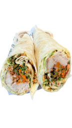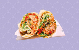 Heerlijke wrap met asian dip, gebakken uitjes, rode panko-kruim, zeekraal, ijsbergsla en gestoomde Makreel