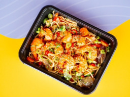 Noedels in teriyakisaus met gegrilde groenten en Gamba's in sesam