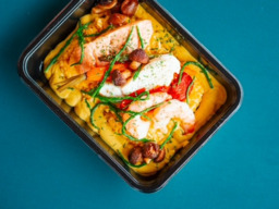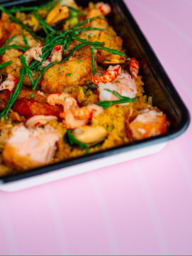 Heerlijk en calorie-arm rijstgerecht met Kip, Garnaal, Kabeljauw, Zalm, Mosselen en Inktvis!