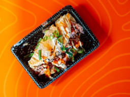 Crunchy rijstrol met zalm, avocado, wortel, crab, komkommer, wakame ijbergsla, gebakken uitjes, Japanse mayo, teriyaki saus en bosui